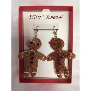 NIB Betsey Johnson Gingerbread Man & Woman Dangle Earrings With Glitter & Pave.