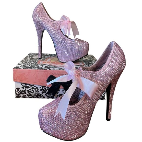 NIB Bordello Teeze-04R Uktra High Stiletto Rhinestone Heels Baby Pink Size 7