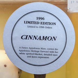 Cinnamon is a matte bay blanket appaloosa with splash spots; star and 4 socks. She is Model # 939 and was produced and sold only in 1996 as a Limited Edition and is no longer available for sale except on the secondary market. She is in her original box, which has never been opened. The box is in remarkably good condition despite its age. Cinnamon is on the Lady Roxana mold and is a Traditional sized model which are approximately 11″ long × 9″ high though it may vary by model.