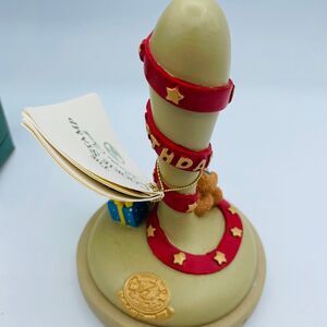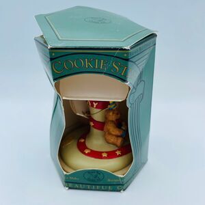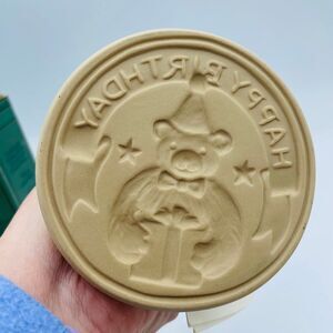 The box is a tad beaten up but the stamp inside is fully intact and still has the original Recipe Book attached. Nice sturdy sized stamper- has a pottery look and feel to it. Adorable teddy bear ready to celebrate sits on top of stamp- can be displayed when not in use. I have another from same brand also listed.