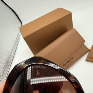 Burberry sunglasses in tortoise shell. Size 55/18/140 comes with box, dust bag, case, and cleaning cloth all in unused condition.