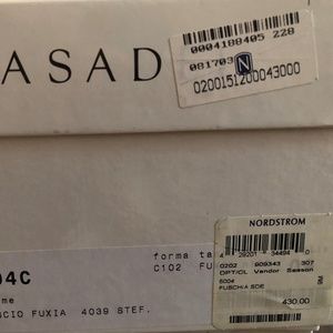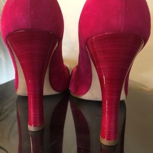 Fabulous fuschia pink suede upper and dyed to match stack heel, 4". New in box. Comes with dust bag.