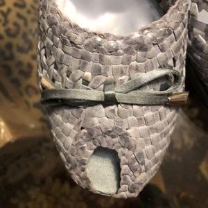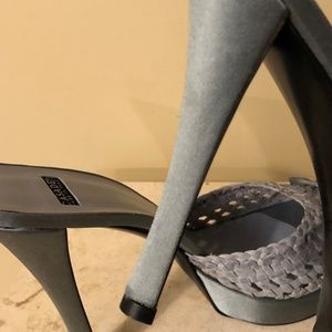 Stunning satin-covered platform & heel, woven leather upper in a fabulous blue grey. Style throwback to the 1940s. Platform just under 1" and heel 5". These are absolutely gorgeous in person. I hesitated on this one.