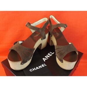 NIB CHANEL G30844 BROWN SUEDE CC LOGO CHARMS PLATFORM WOODEN SANDALS 39 $1025