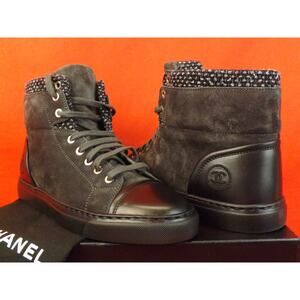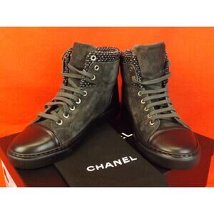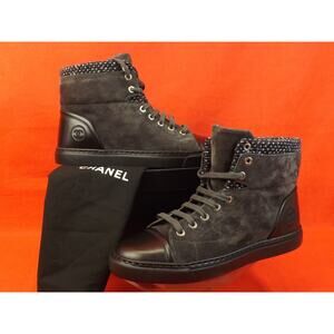 NIB CHANEL G31058 GRAY BLACK SUEDE TWEED LEATHER CC LOGO HI TOP SNEAKERS 36.5