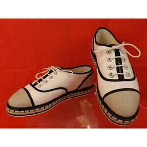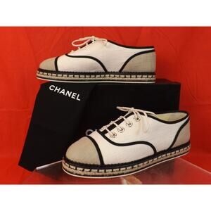 LIGHT BEIGE /DARK BEIGE PEARLS "CC " LOGO LACE UP ESPADRILLE FLATS TENNIS SNEAKERS