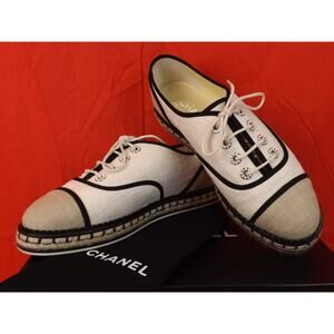 NIB CHANEL G31345 BEIGE CANVAS LACE UP PEARLS CC ESPADRILLE FLAT OXFORDS 39.5
