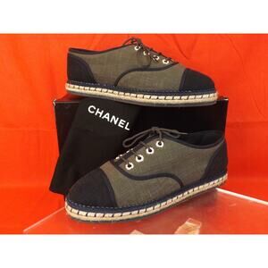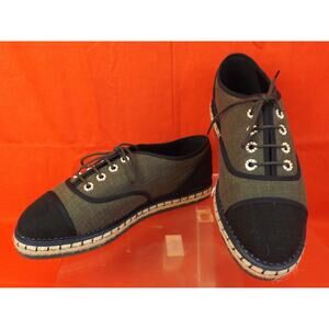 NIB CHANEL G31345 GREEN BLACK CANVAS PEARLS CC ESPADRILLE OXFORDS FLAT 39.5 9