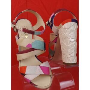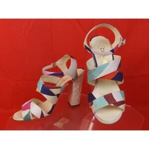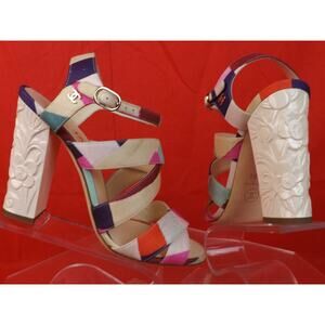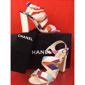 NIB CHANEL G31467 MULTI COLOR CANVAS METAL CC LOGO FLOWERS HEEL SANDALS PUMPS 38