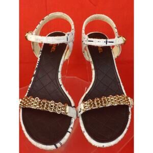 NIB CHANEL WHITE TWEED GOLD CHAIN CC PEARL LOGO SANDALS LOW HEEL PUMPS 37.5