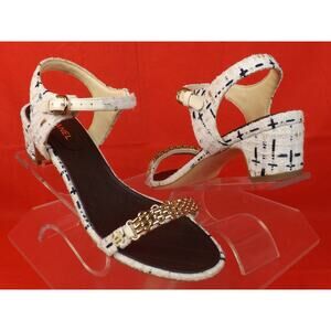 WHITE /ECRU/NAVY TWEED THICK GOLD TONE CHAIN CC PEARL LOGO SANDALS LOW HEEL PUMPS