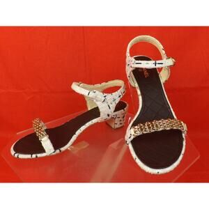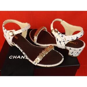 NIB CHANEL WHITE TWEED GOLD CHAIN CC PEARL LOGO SANDALS LOW HEEL PUMPS 38.5