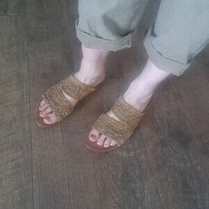 Super chic and eye-catching, these sandals flatter with tan woven leather straps and handcrafted charm. Beautifully hand crafted to mold to your foot over time for a custom fit. Dress them up or down. Your new perfect summer sandals.