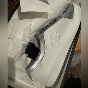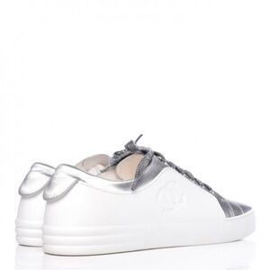 NIB Chanel Iridescent Goatskin Womens Sneakers 41 White Silver