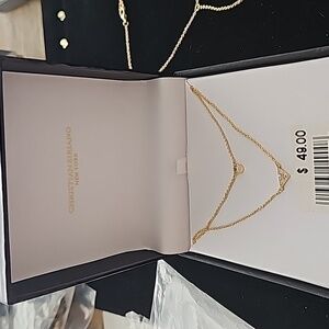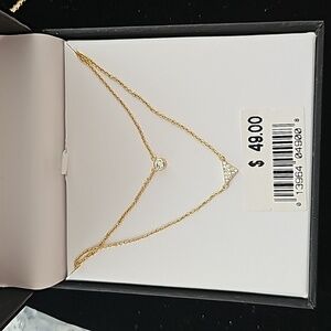 dainty gold tone double layered necklace featuring round and triangle pave zirconia