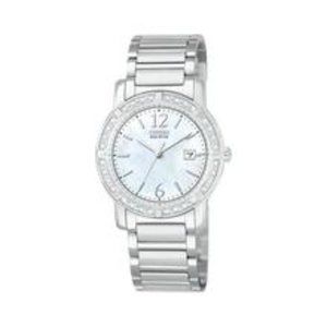 Women's watch features brushed finish stainless steel case set with diamond bezel. This beautiful watch also comes with high quality Eco Drive Swiss quartz movement, scratch resistant mineral crystal, water resistant up to 30 meters, brushed finish stainless steel bracelet and white mother of pearl dial with date display and luminous hands and hour markers.