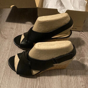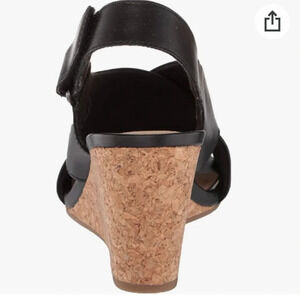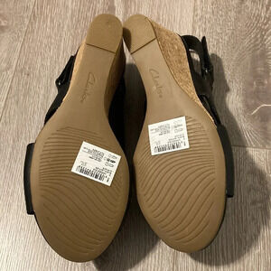 Clarks Margee Eve Black Leather Slingback Cork Wedge Sandal in size 7 1/2W. New in box, absolutely love these sandals but I ordered a wide by mistake and missed the return deadline. Ortholite footbed, smooth textile lining that wicks moisture, ultra-lightweight, heel measures approximately 2.83”. Excellent new condition from smoke free and pet free home. Please see photos for details, first photos are the actual shoes and others are stock photos.