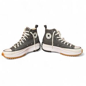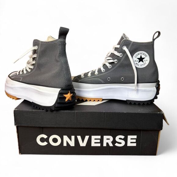 Authentic Converse Run Star Hike High Top in Iron Gray canvas with crisp white platform midsole, black jagged gum outsole, and crisp white toe cap/laces. These are a very cool sneaker blend between the iconic Chuck Taylor street style and trail-inspired chunky soles.