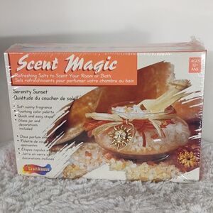 This New in sealed box Craft House Scent Magic Serenity Sunset Bath Salt Kit is for ages 12+. #00860. Kit contains: 2-12oz bags of sea salts, 2 poly bags, 2 colorants, 1 scent, 1 glass jar, 3-36" strands of raffia, 1 brass charm and directions. All offers welcome.