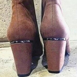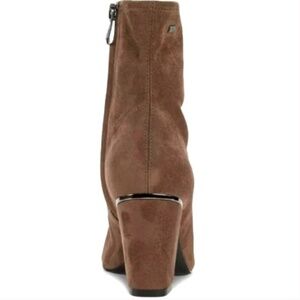 New, unworn with original box these tan, suede-like DKNY Cavale Stretch Ankle Booties have a 3-3/4" heel, almond-shaped toe, inner ankle zipper closure. Height: 5.71" Circumference: 9.25". Flexible outsole, stretch fabric upper, lined, comfort insole. Rubber sole. Women's Size 9. Pet/smoke-free home, fast shipping!