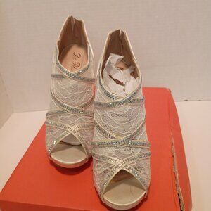 New in box from DE BLOSSOM COLLECTION, perfect for bridal or formal event like prom, 4" high ivory lace open-toe stiletto heels decked out with rhinestones. These size 6 heels are open toe and have a zipper at the heel. Style EYAEL-58, retail price $59.95.