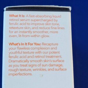 Retinol serum supercharged by Ferulic Acid to dramatically smooth skin’s surface as you treat signs of sun damage, rough texture, wrinkles and surface imperfections for a smoother, more even, lit from within glow.