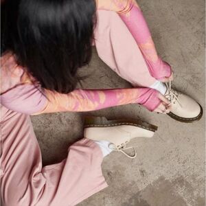 Neutral summer tones — worn in from the first step, so you can make the most of the longer days. We've built our Original 1461 3-eye shoe using soft, pebbled Virginia leather. The shoe is made as it has been since the 60s: welted on a translucent grooved DMS outsole and secured with our signature yellow welt stitching. Each shoe is detailed with a bitter choc welt and antique gold eyelets