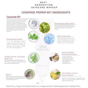 But that's not all – our formula is a powerhouse of skincare and beauty benefits. Infused with hydrating and skin-loving ingredients like allantoin, licorice root extract, lemon peel oil, sodium hyaluronate, olive fruit oil, and centella asiatica extract. Each ingredient works together synergistically reducing dark spots, calming inflammation like acne, increasing ceramides to enhance your skin’s resilience. Say bye-bye to many topical skin conditions that create makeup frustrations. Elevate your routine with our Ceramide Primer that transcends makeup prep – and celebrates skin health.