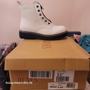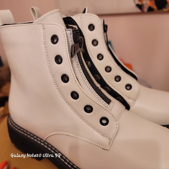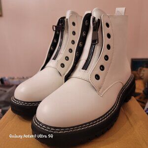 Dress them up.. dress them down.. These boots are sharp. New in box from TJ Maxx I bought and then just never wore. They are stark white with zipper down front - sole is chunky and comfortable looking.