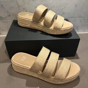 EILEEN FISHER espadrille sandal with a modern twist. The MAYLA slide sandal features a three-band upper and a rope-wrapped wedge heel. Padded toe, heel and arch for comfort. Leather lining. Flat ~1.5" platform base with non-slip rubber outsole. Retail $185.
