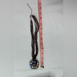 This artistic piece is enhanced with matching strands of beads on the necklace
