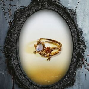 This is a beautiful hammered copper joined band ring. It has a natural stone that varies in color from ocean green sky blue and it is surrounded by coppery leaves and glittering rhinestones. It is a very beautiful ring. Size 7. Will come in a gift box.