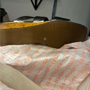 Chic metallic silver sandals by Easy Spirit. Features a comfortable design with stylish cork heel.