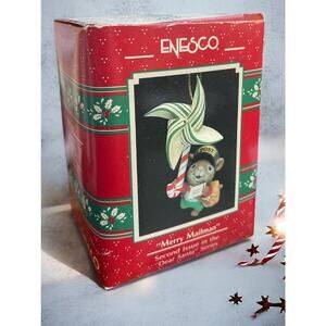 This Enesco Treasury of Christmas ornament from the Dear Santa series features a festive mouse mailman delivering a letter addresses to Santa. (Produced in 1990 or 1991)