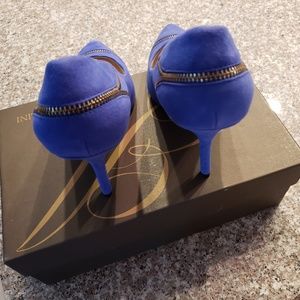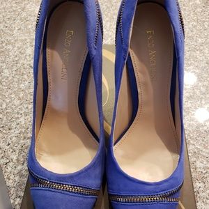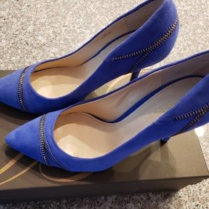 Brand New in Box, Sz 9 Enzo Angiolini Eapoculture Blue Suede Heels with zipper like accents. They have a pointed toe.