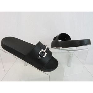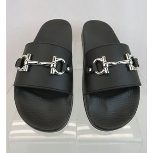NIB FERRAGAMO GROOVY 11 BLACK RUBBER SILVER GANCINI BIT LOGO SANDALS SLIDES 10 M