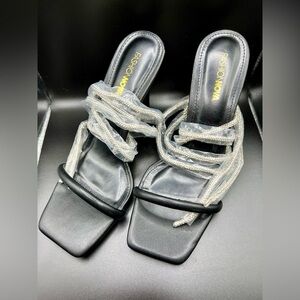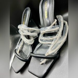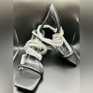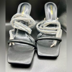 NIB Fashion Nova Black Stiletto Heels w/ Square Toe & Crystal Embellished Straps
