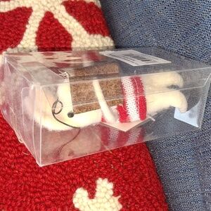 Cute new-in-box felted rabbit bookmark. About 4" tall, this cute felted wool rabbit, wearing a striped sweater and glasses and holding a book, sits on a paperclip that you can use to mark your own book.