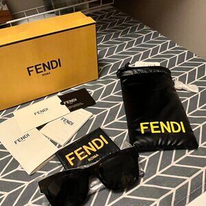 NIB Fendi's sunglasses feature a square silhouette crafted of acetate. The temples are adorned with a tone-on-tone diagonal metal insert, showcasing the lasered "FF" pattern on the tips.
