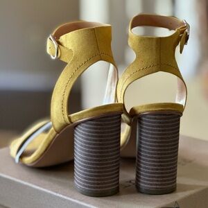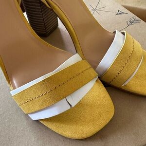 Francesca’s Indigo Road Mustard Color Sandals. Aidan cut with gold buckle ankle strap and stacked heel. There is a small dark spot on the right shoe across the top (see pic) it may come off but I wanted to note it. Otherwise, new with no flaws. Size 7