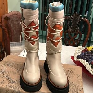 Great nylon puffer boot for cold, snow, rain weather. Knee length, aztec design with wrap around strings for comf and design