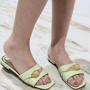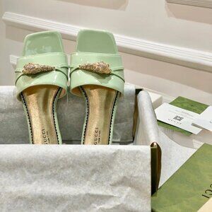 With a defined block heel, this slide sandal is introduced with the House's snake head hardware in gold-toned metal. Presented in black patent leather, this style is enhanced by the timeless silhouette.