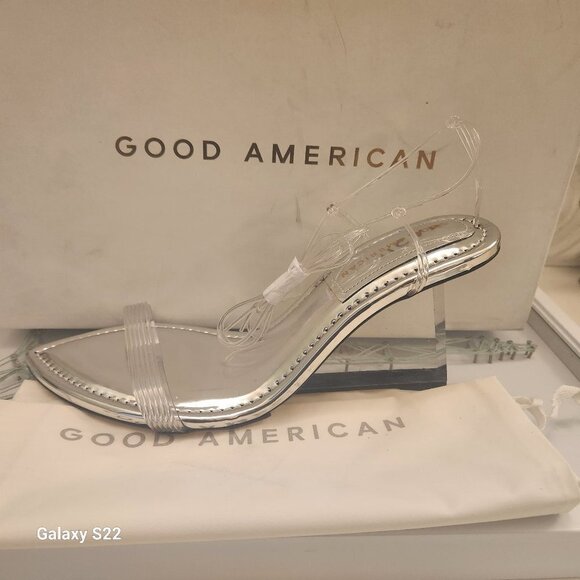 NIB Good American Cinder-F*cking Rella Wedge Silver. Size: various. The pictures are of a size 9, I have more sizes in the same condition. The boxes have dust markings and some minor damage. Smoke free home. No odors. All offers are welcome. Thank you!