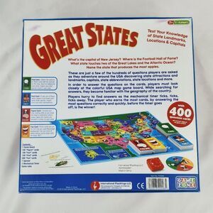 State trivia game with timer. Better than average components. What's the capital of New Jersey? 300 "Figure", "Fact" and "Find" cards to discover the USA. Questions must be answered before the timer runs out!