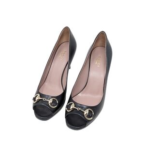 NIB Gucci Black Leather Horsebit Classic Timeless Hollywood Peep Toe Heels Pumps Size EU 37