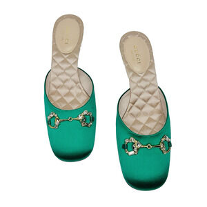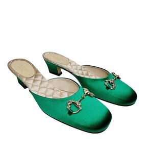 NIB Gucci Horsebit Crystals Satin Mules IT 36.5 US 6.5 Slip On Emerald Green Sandal $1,150