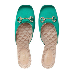 Authentic Gucci Horsebit Satin Mules, crafted in luxurious emerald green satin. A sparkling crystal-embellished Horsebit adds a signature House detail, while the matelassè lining ensures comfort and elegance. Finished with a low 1.7” heel and a sleek leather sole, these slip-on mules perfectly balance modern glamour with classic Gucci heritage.