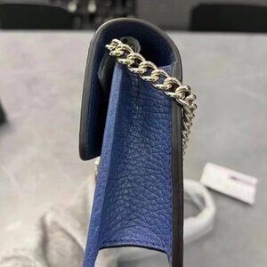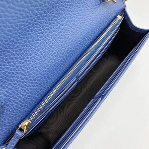 The Gucci Interlocking GG Wallet On Chain in Blue is a versatile and chic accessory. Designed with 18 card slots and the iconic interlocking GG logo, this wallet combines practicality with luxury, perfect for both day and evening wear.