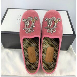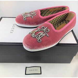 NIB Gucci Pink Velvet Pearl Monogram Slip on Loafers Size 5.5