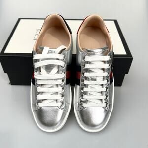 NIB Gucci Womens Silver Leather Ace Embroidered Web Low Top Sneakers Size 34